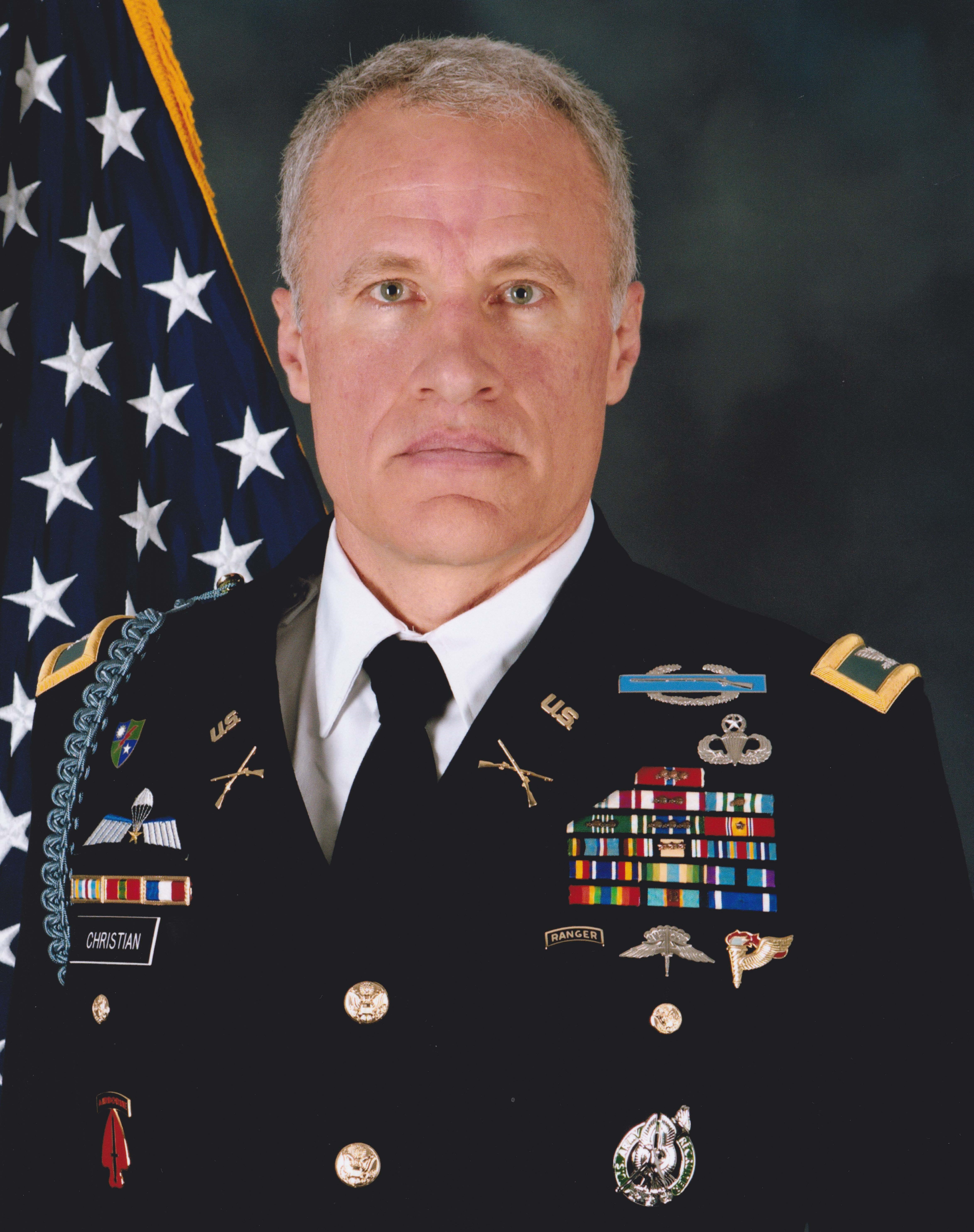 COL (R) Christian’s awards and decorations: Legion of Merit; Bronze Star w/ 3 Oak Leafs; Defense Meritorious Service Medal w/ Oak Leaf; Joint Service Commendation Medal w/ Oak Leaf; Meritorious Service Medal w/ 2 Oak Leafs; Army Commendation Medal w/ 2 Oak Leafs; Army Achievement Medal w/ 3 Oak Leafs; Philippine Military Civic Action Medal; Joint Meritorious Unit Award; USA/USAF Presidential Unit Citation; Army Superior Unit Award; National Defense Service Medal w/ Oak Leaf; Armed Forces Expeditionary Medal; Global War on Terrorism Expeditionary Medal; Global War on Terrorism Service Medal; Armed Forces Service Medal; Humanitarian Service Medal; IRAQ Campaign Medal w/ 3 Campaign Stars; Army Service Ribbon; Overseas Service Ribbon (2 nd Award); Philippine Republic Presidential Unit Citation; NATO Medal; Combat Infantryman Badge; Expert Infantryman Badge; Silver Basic Recruiter Badge; Ranger Tab; Pathfinder Badge; Master Parachutist Badge; Basic Military Freefall Parachutist Badge; German Armed Forces Parachutist Badge Bronze; Royal Netherlands Army Parachute Badge.