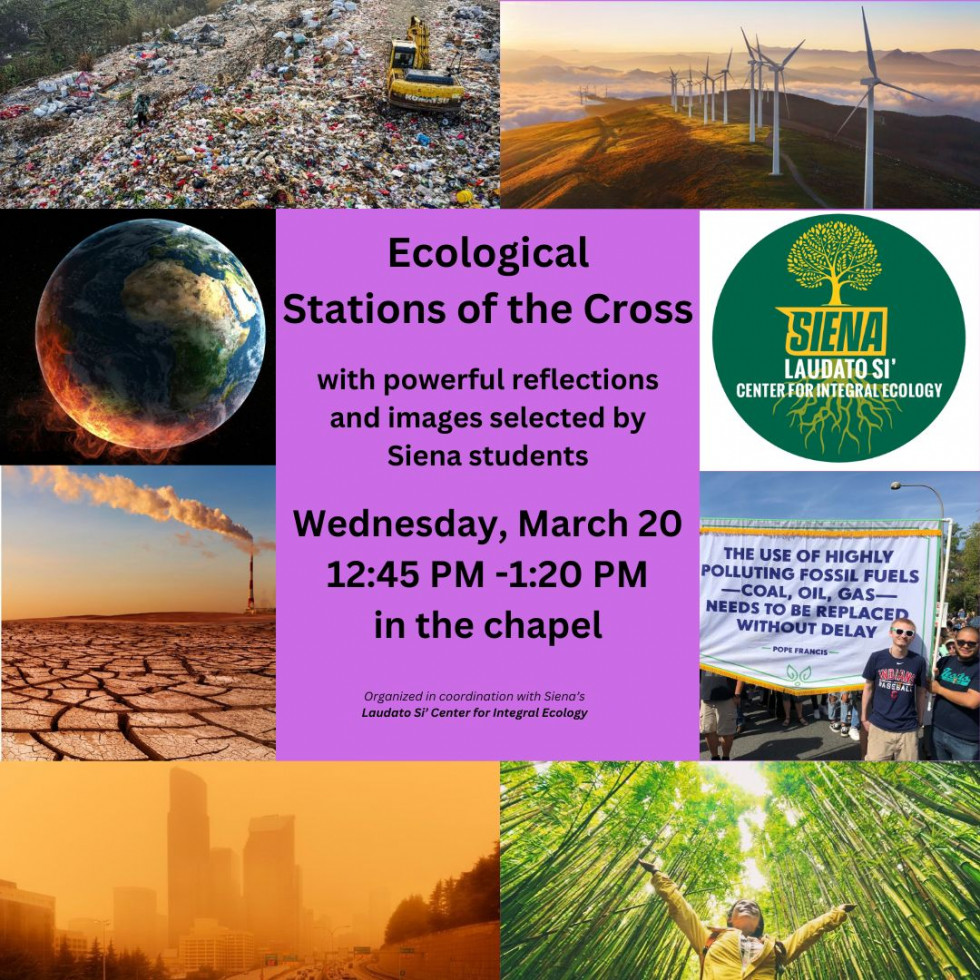The life, teaching, and mission of Jesus Christ were defined by his fierce love; one in radical solidarity with the poor, marginalized, and those who suffer. Those include other non-human members of earth's community of life, the entire ecosystems, and future generations. At the Ecological Stations of the Cross, we will hear a powerful selection of quotes from Saint John Paul II, Pope Benedict XVI, and Pope Francis. Those quotes and corresponded images have been selected by a group of Siena College students. Those quotes and images challenge us to see the world through God’s eyes of compassion; to make room in our hearts and minds for those rendered voiceless in our society, and to choose a path that leads to a more abundant life.