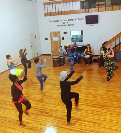 Diallo, who has taught in Senegal, Italy, Spain, Poland and Germany, begins his dance class with an hour long warm up to get everyone loosened up and familiar with the body movements. Adding to the atmosphere is live African drumming, played by Jamurrell Stanley, Wayne White, Gabrielle Tigris and Michael Burstein. The guest drummers welcomed management major Michael Cesario ’16, who brought his own drum, to join them in playing.