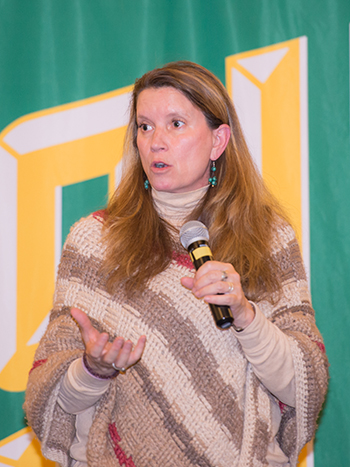 After the Stack Center meeting, Stevens headed over to her main talk in the SSU. Wherever she speaks, Stevens brings with her one or two of the women whose lives were turned around by Thistle Farms. Siena welcomed Jennifer and Tiffany for this event.