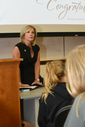 Founder, President and CEO of Fusco Personnel, Inc., Patricia Fusco, visited campus last week to speak to students as part of the annual School of Business Lecture Series Program. Fusco founded her company in 1994 and has since led the firm to a statewide reputation for premiere work in executive searches, human resource consulting, analysis of institutional needs, mid-level recruits, as well as temporary, temp-to-perm and contract staffing. Fusco firmly believes in giving back to the community and has held many association affiliations and board positions.