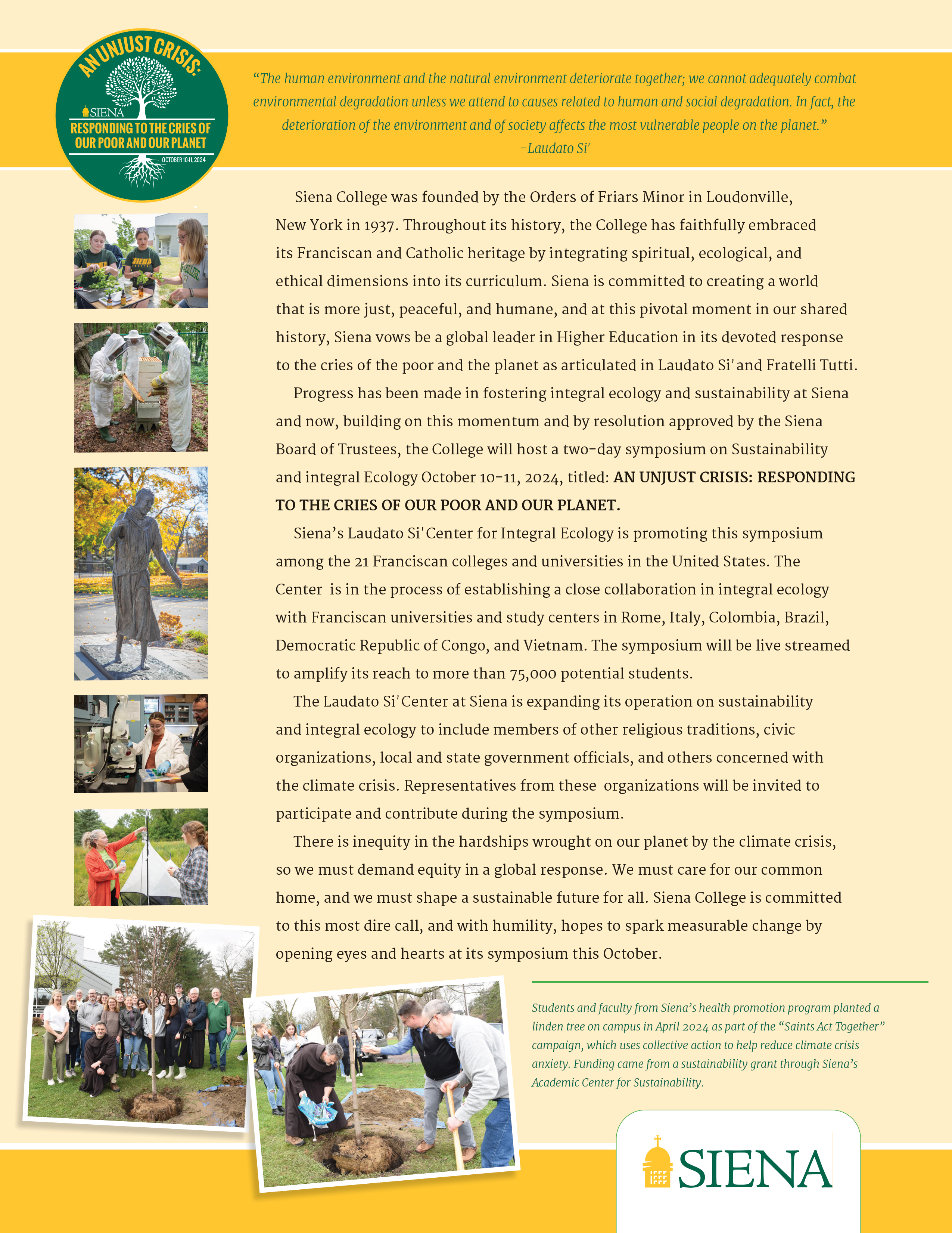 On a Franciscan Pilgrimage to Italy, President Chuck Seifert and his wife Deb, joined by Siena Friars as well as members of the Siena Board of Trustees, were granted a private audience with Pope Francis. Fr. Michael Perry, O.F.M., Franciscan Scholar in Residence and director of the Laudato Si’ Center for Integral Ecology, arranged the visit. Fr. Michael presented Pope Francis with this letter, below, highlighting the work of the Laudato Si’ Center and promoting a two-day symposium on sustainability and integral ecology, to be hosted by Siena this October, titled An Unjust Crisis: Responding to the Cries of our Poor and our Planet.