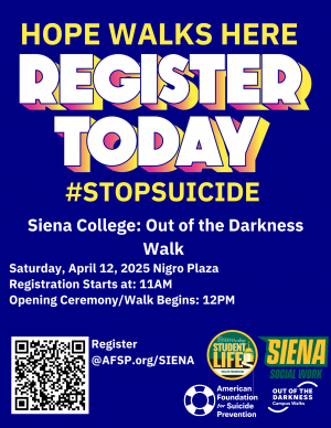 7th Annual Out of the Darkness- Suicide Prevention WalkApril 12th11-1PMSiena College- Nigro Plaza